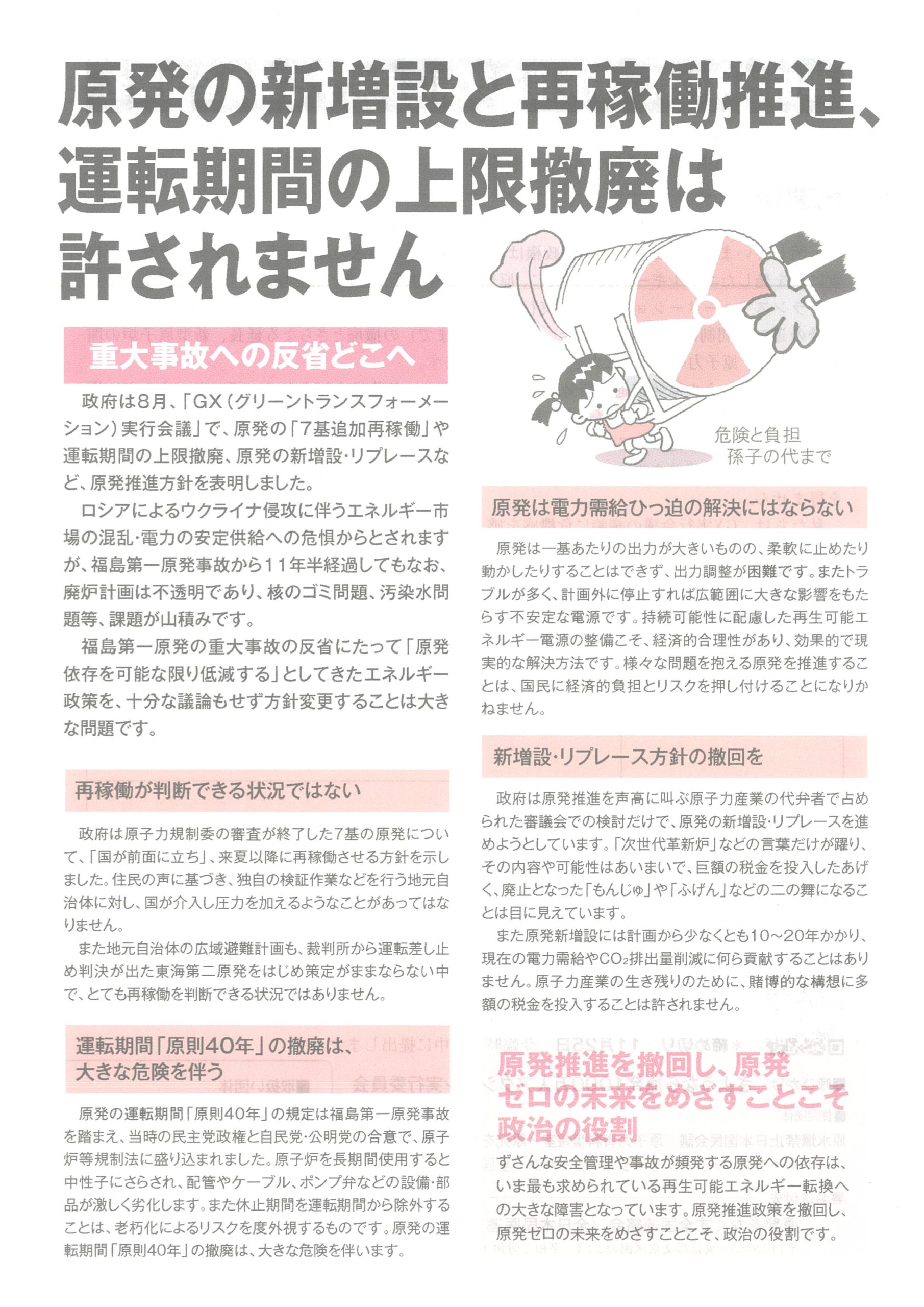 原発の新増設と再稼働推進、運転期間の上限撤廃は許されません