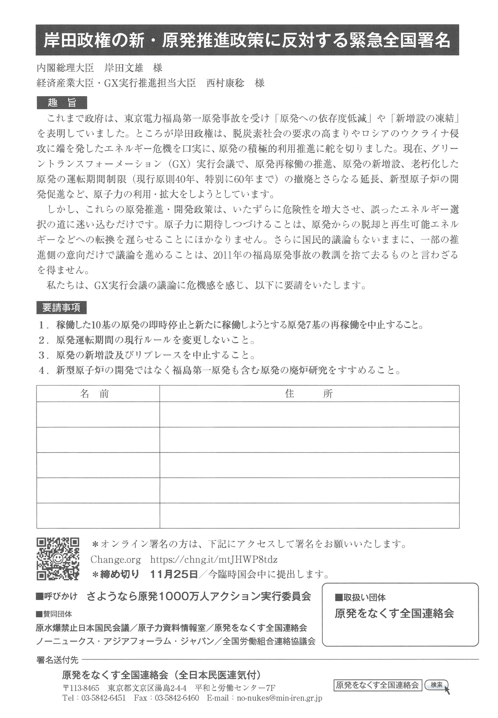 - 稼働した10基の原発の即時停止と新たに稼働しようとする原発7基の再稼働を中止すること。